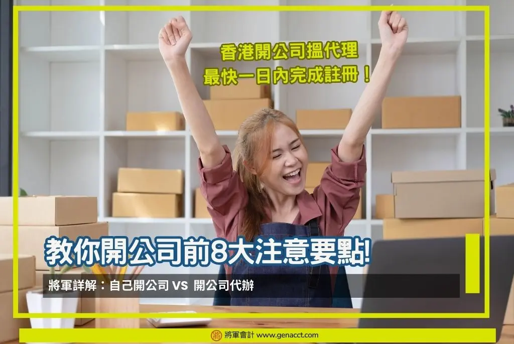 香港開公司可以自己做,也可以交由開公司代辦,兩種方法有什麼分別? 創業人士應該怎樣選擇? 將軍會計擁有20多年香港開公司經驗,以專業開公司代理角度,為大家綜合開公司前需了解的8大注意要點! ,讓創業人士更省錢省時自己開公司,更快做生意,踏出創業第一步。